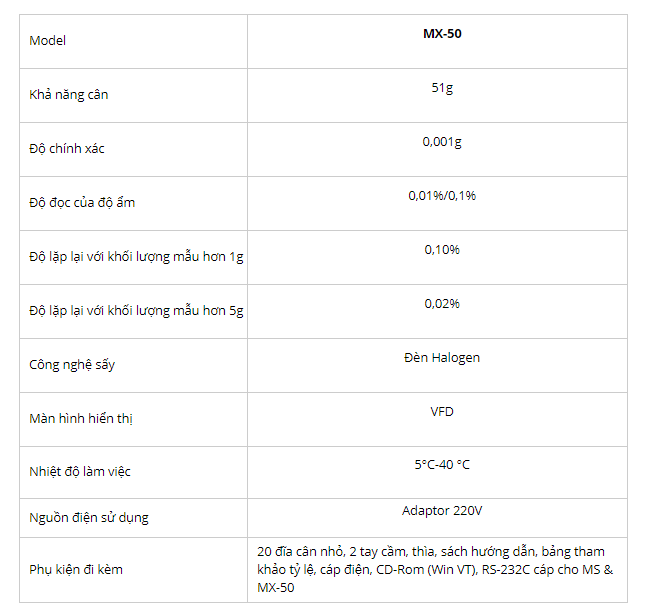 – Thông Số Kỷ Thuật Cân Sấy Ẩm MX-50:
